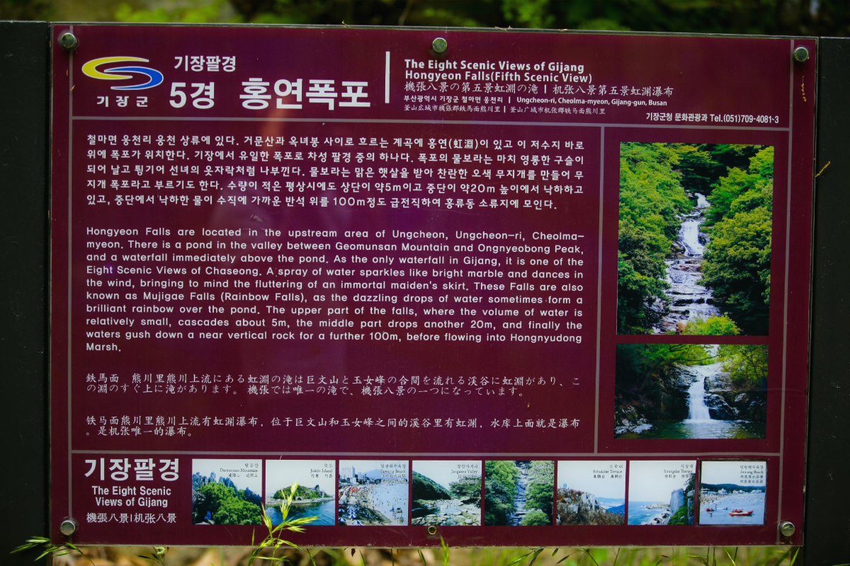 홍연 폭포는 부산광역시 기장군 철마면 웅천리에 있는 대한민국의 폭포입니다. 수영강의 지류인 철마천의 발원지이며, 거문산과 옥녀봉 사이에 위치하고 있습니다. 차성가에는 구천 은하 은하수가 떨어져 내리는 듯하다는 홍연 폭포의 장관을 노래하며, 폭포의 물보라는 마치 영롱한 구슬이 되어 날고 튕기어 선녀의 옷자락처럼 나부낀다라고 합니다. 물보라는 맑은 햇살을 받아 찬란한 칠색 무지개를 만들어 무지개폭포라고 부르기도 한답니다. 수량이 적은 평상시에도 상단이 약 5m이고 중단이 약 20m 높이에서 낙하하고 있고, 중단에서 낙하한 물이 수직에 가까운 반석 위를 100m 정도 급전직하하여 홍류 저수지에 모입니다. 기장군의 유일한 폭포이다.