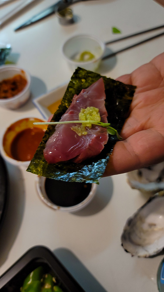 소짜 이거하나로 집사람과 큰딸하고 셋이 배부르게 먹었습니다 사실 대방어가 지금 기름기도 많고 해서 많이 먹어지는 회는 아닙니다 ㅋㅋㅋ 물론 많이 드시는 분도 계시겠지만 위의 소짜정도의 양이면 성인둘이서 소주한병씩? 까기에 딱 좋은 양인거 같아요 맛을 음미하면서 1점 1잔~ 저도 어제 1병 했습니다