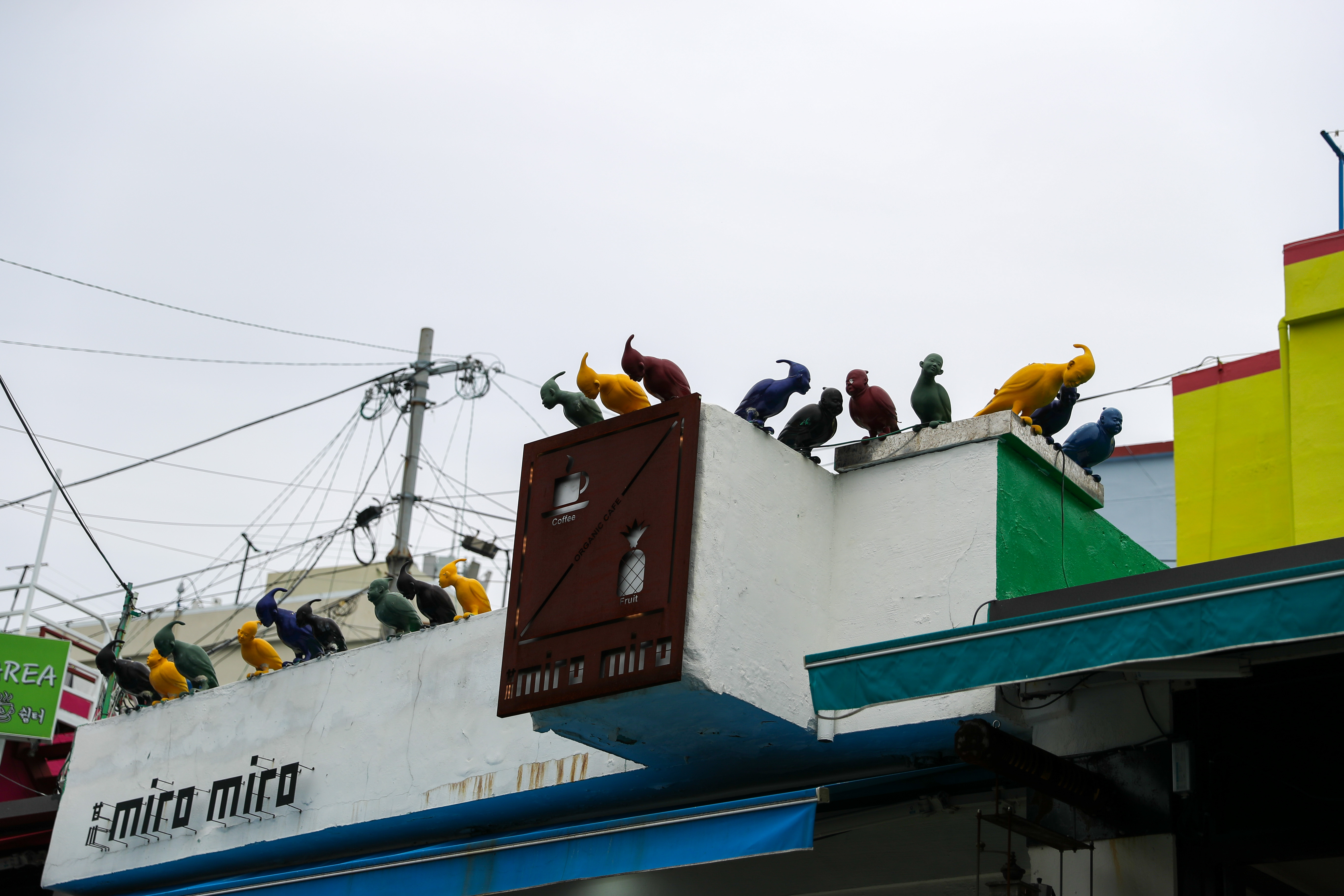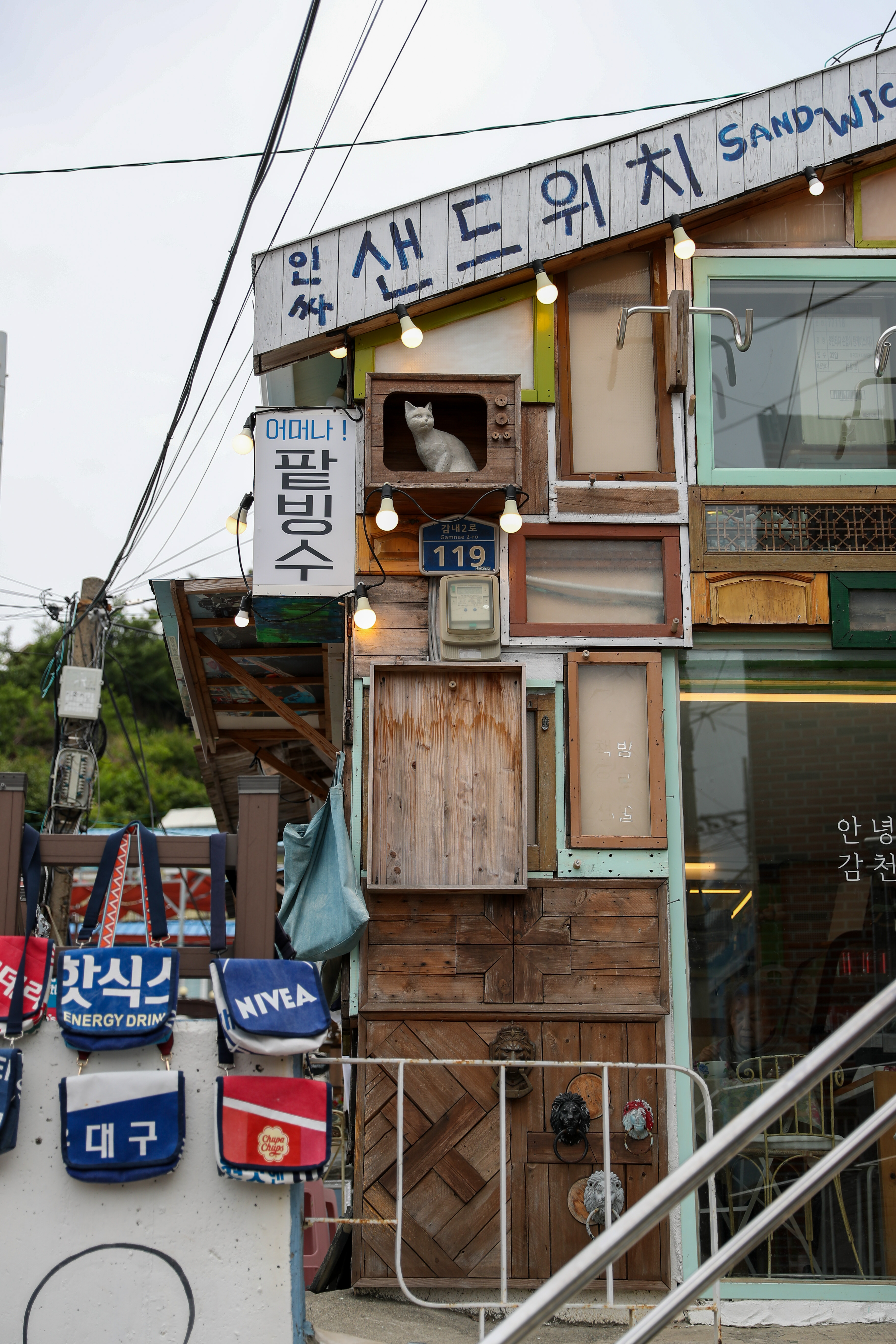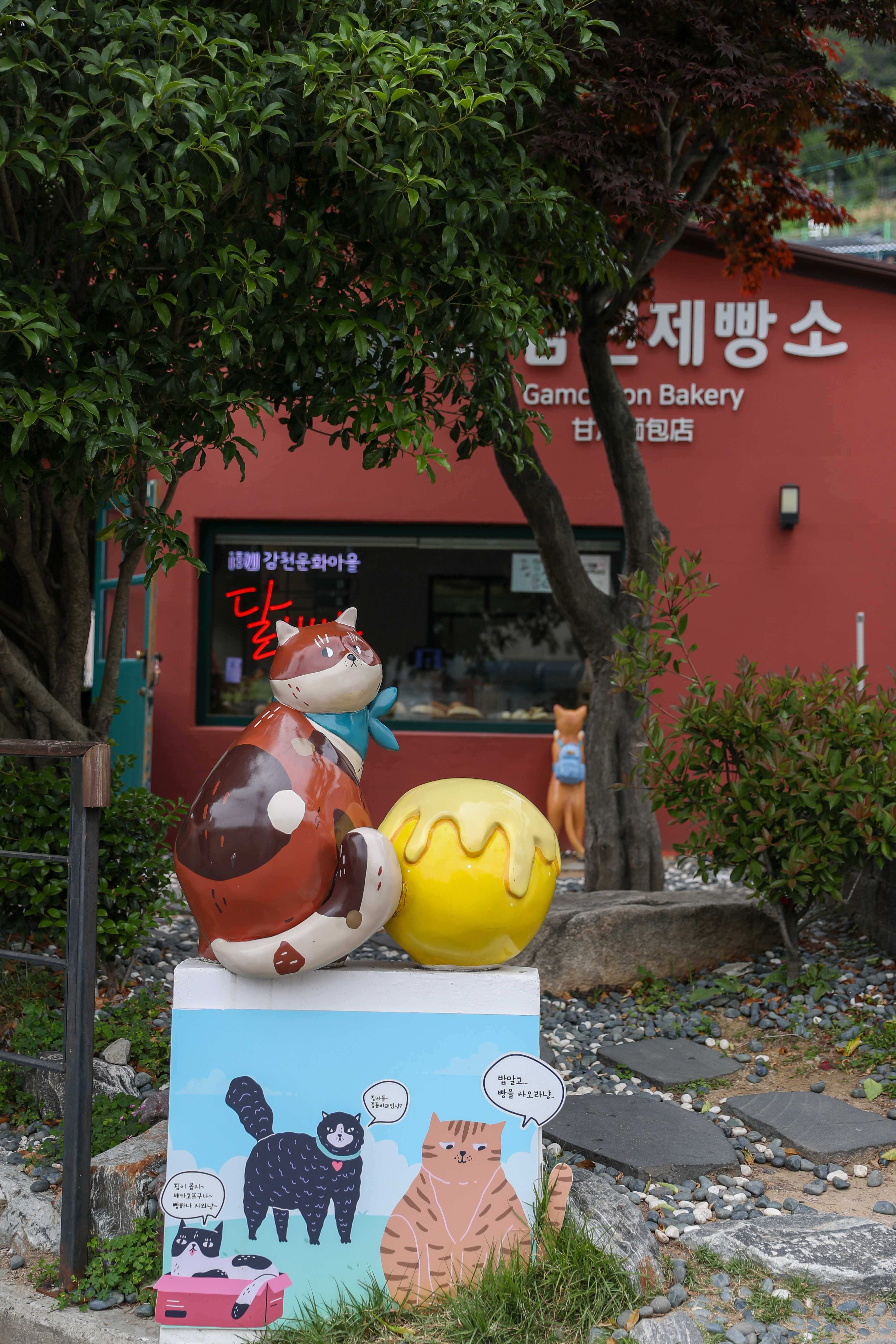 군데군데 여러 카페들과 즐길거리 가게들이 간간히 있습니다 특히 산동네답게 고양이 동상이 자주 보이더군요